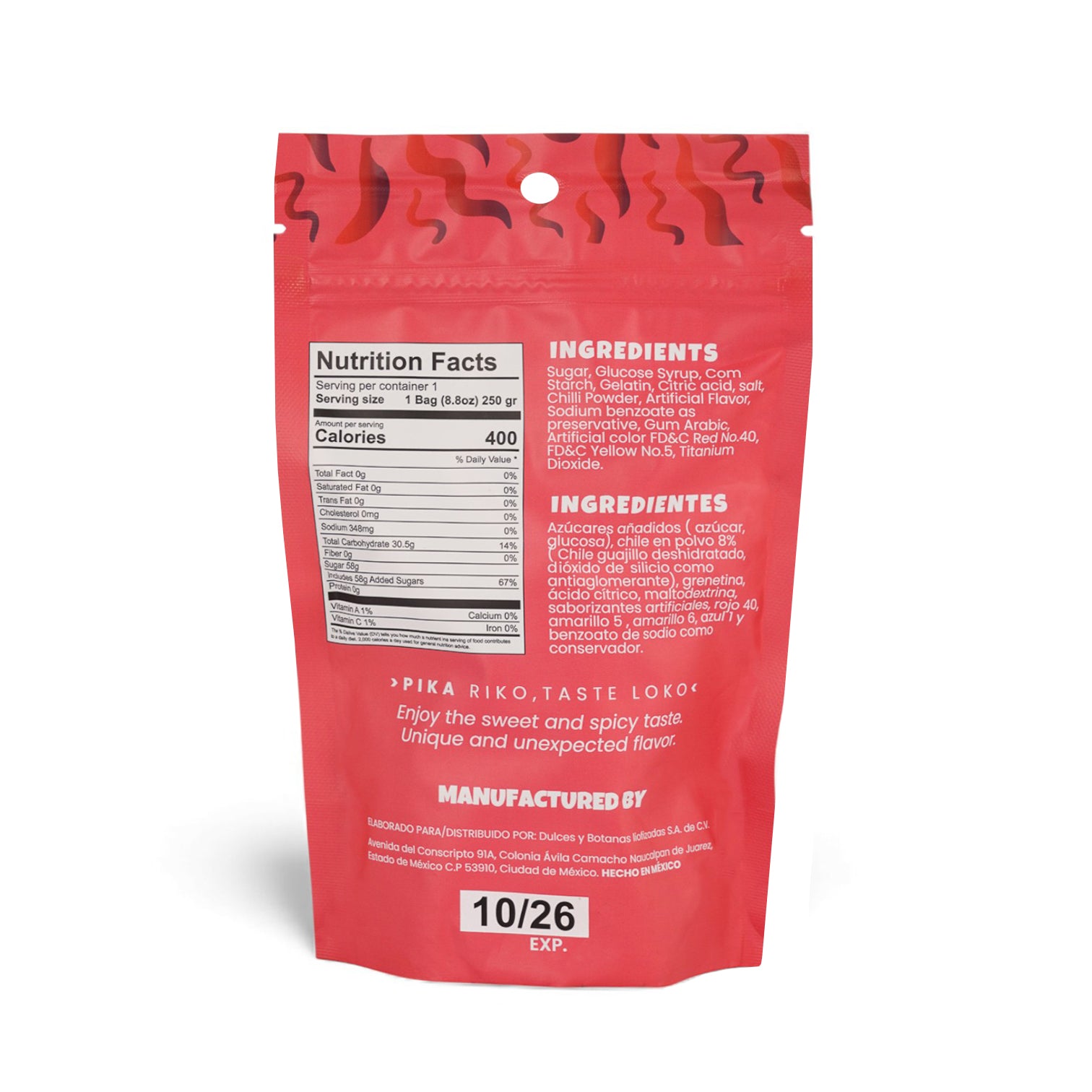 Gomitas sabor cereza y limón (grenetina, azúcar, jarabe de glucosa, acidulantes, saborizantes), chamoy Pikaloco (tamarindo, agua, azúcar, sal, ácido cítrico), mezcla enchilada (chile en polvo, azúcar, sal, ácido cítrico).