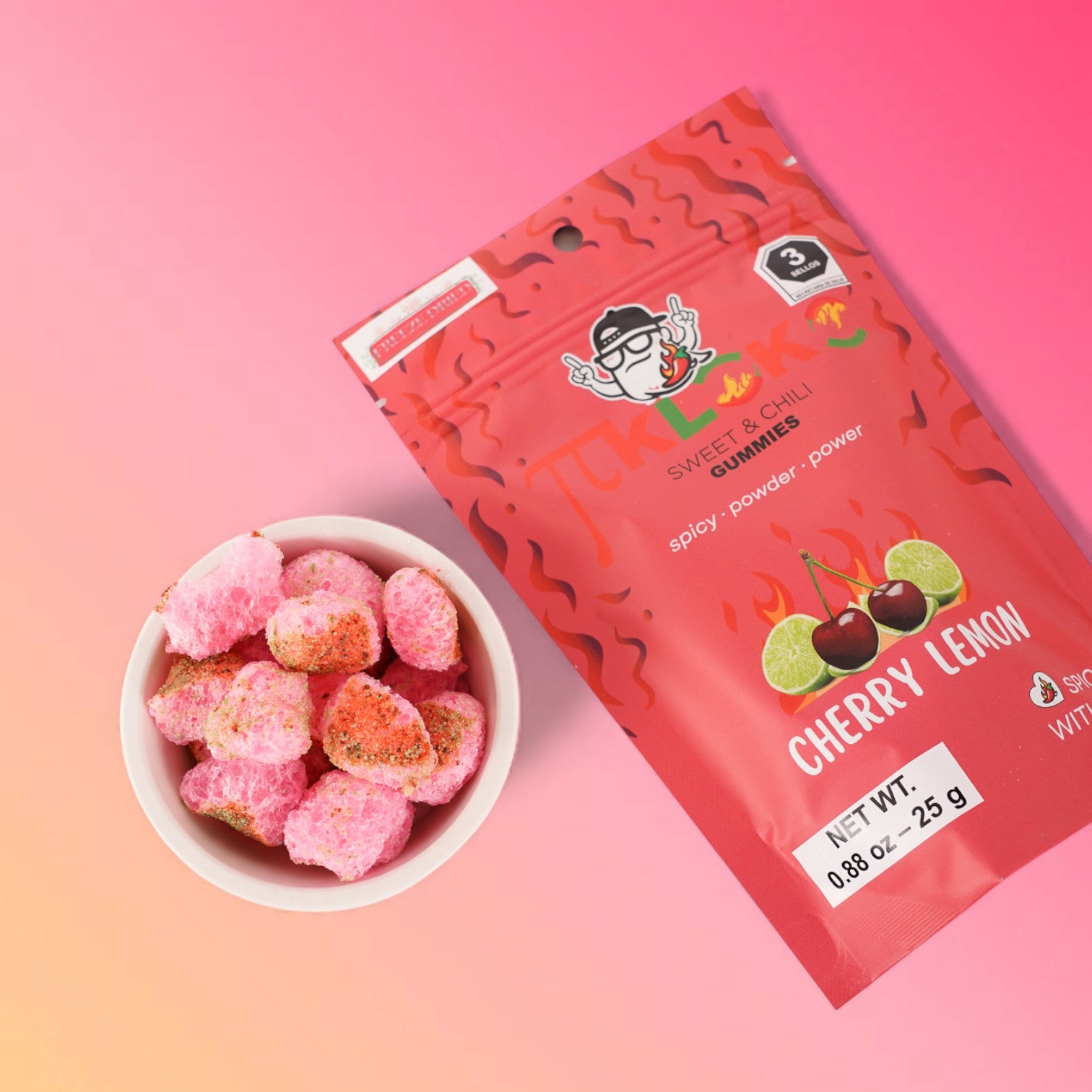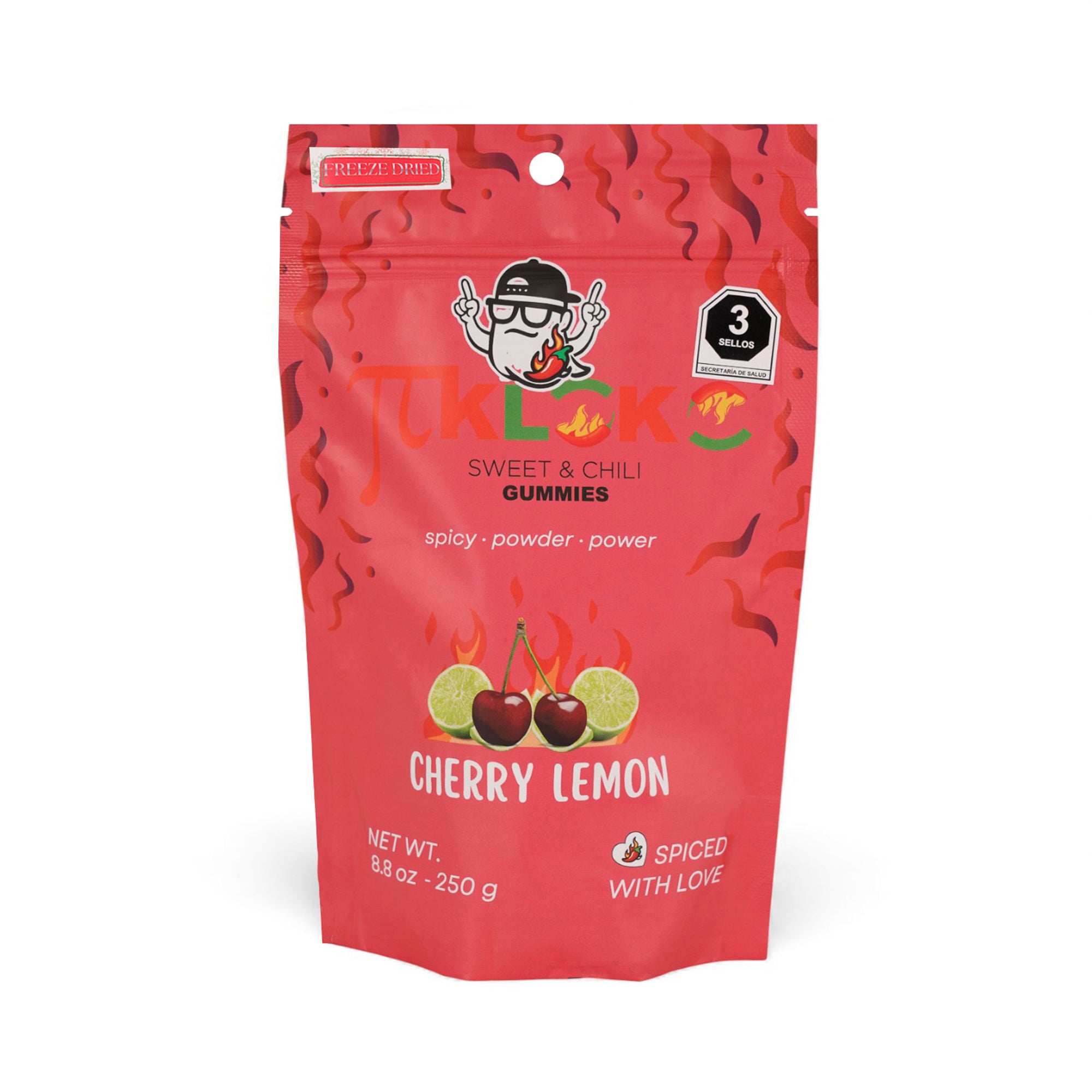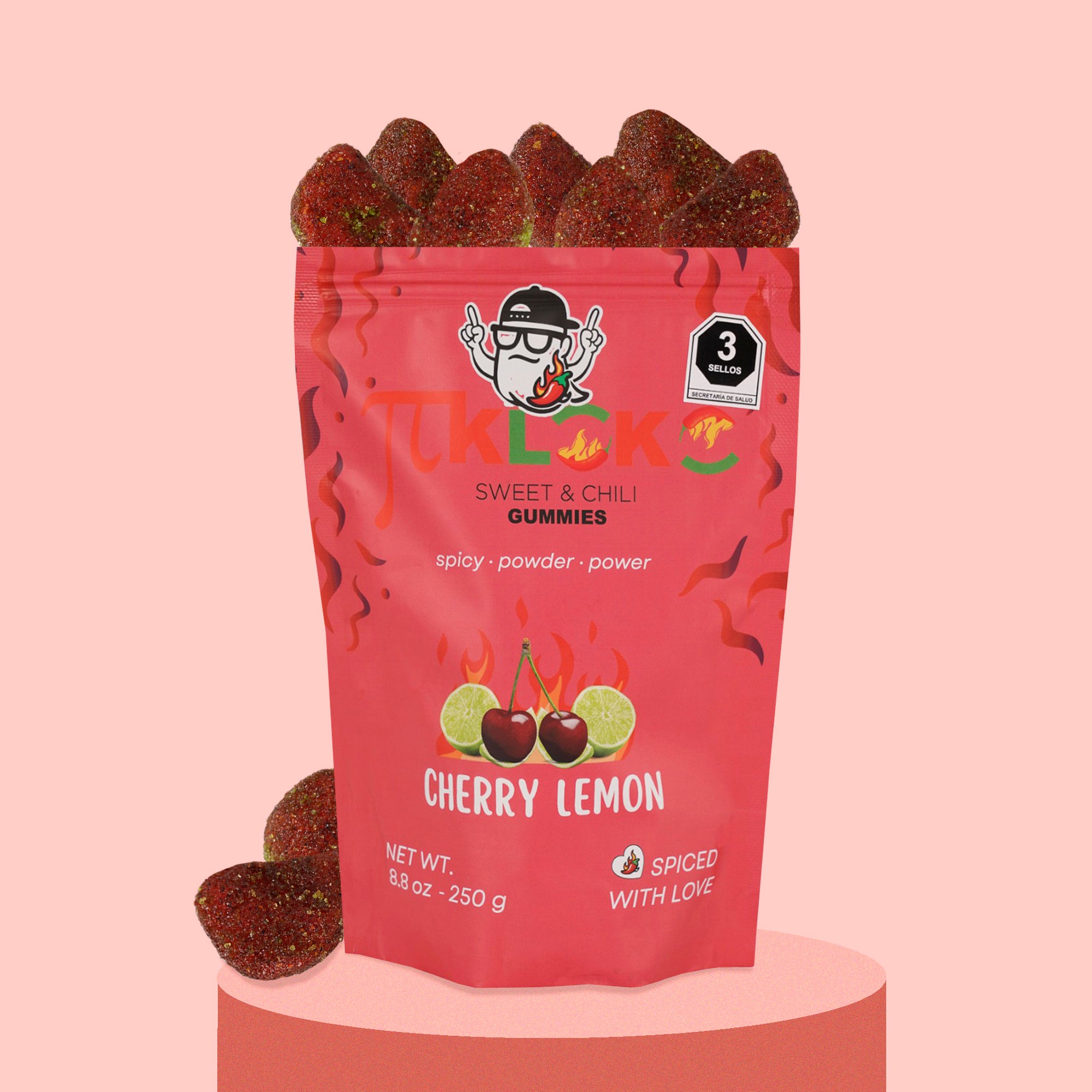 Gomitas de cereza + limón cubiertas con chamoy Pikaloco y chilito Spicy Plus (picoso), luego freeze-dried (liofilizadas) para lograr una textura crujiente, ligera y cero pegajosa. Dulce, ácido y picante en cada mordida.