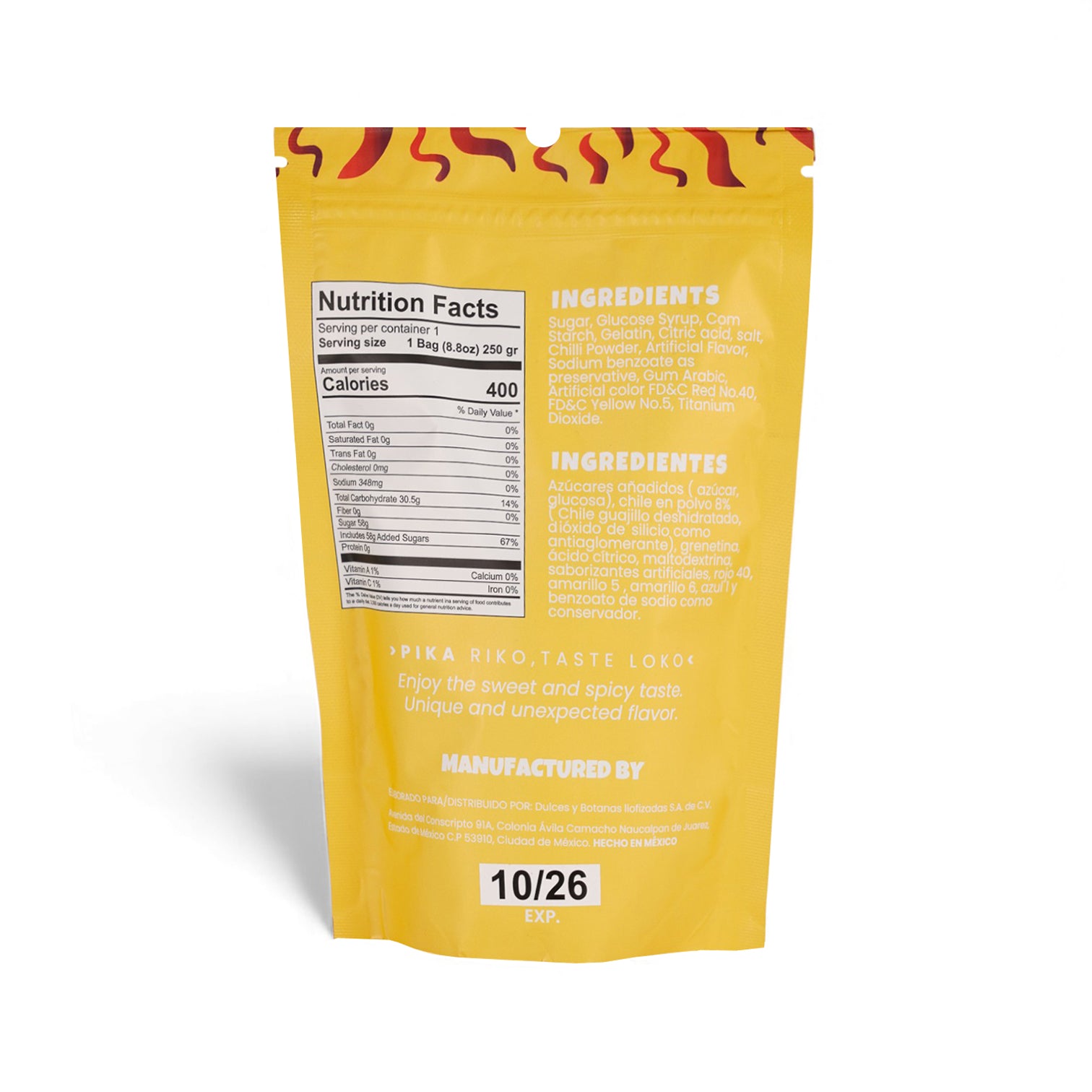 Gomitas sabor piña y coco (grenetina, azúcar, jarabe de glucosa, saborizantes), chamoy Pikaloco (tamarindo, agua, azúcar, sal, ácido cítrico), mezcla enchilada (chile en polvo, azúcar, sal, ácido cítrico).