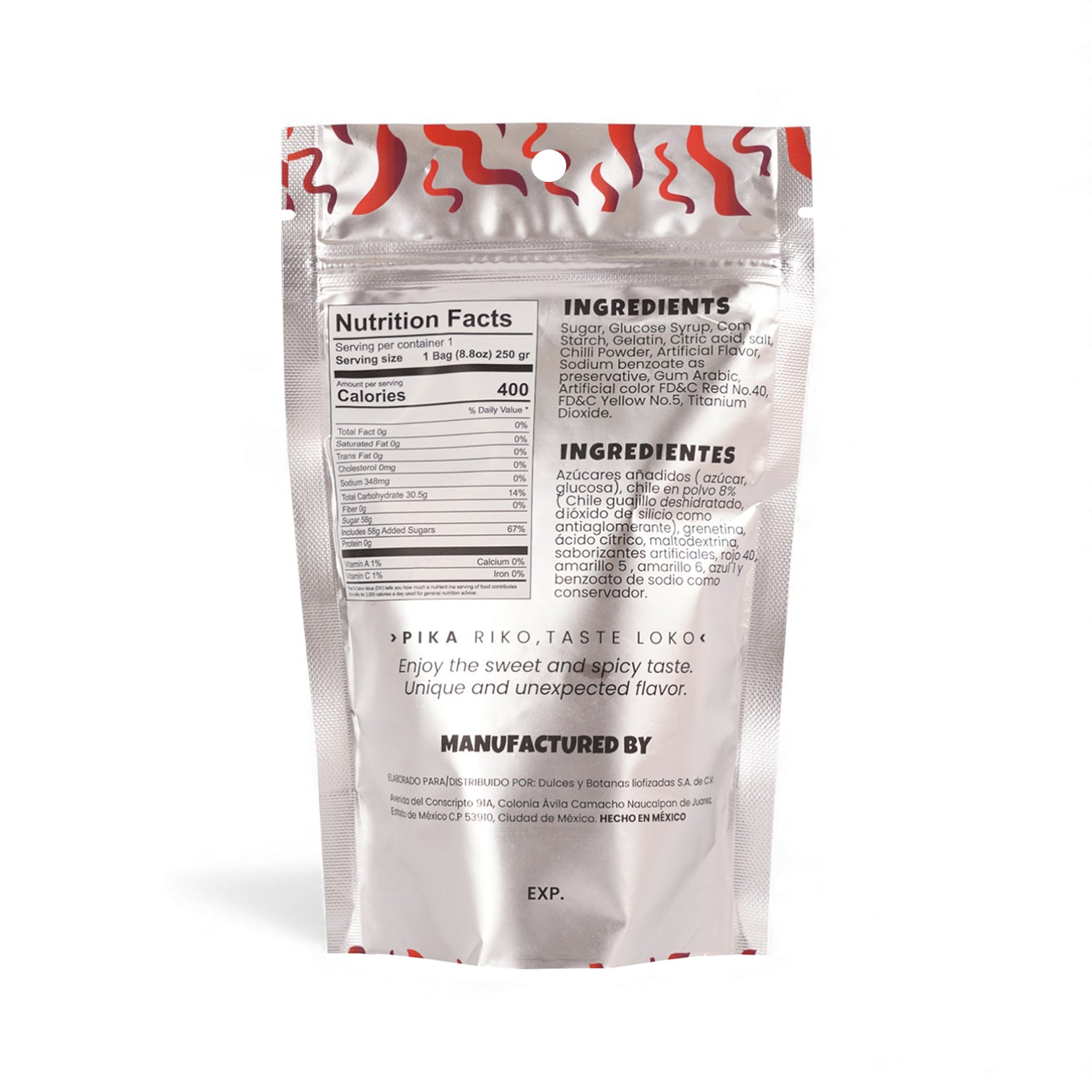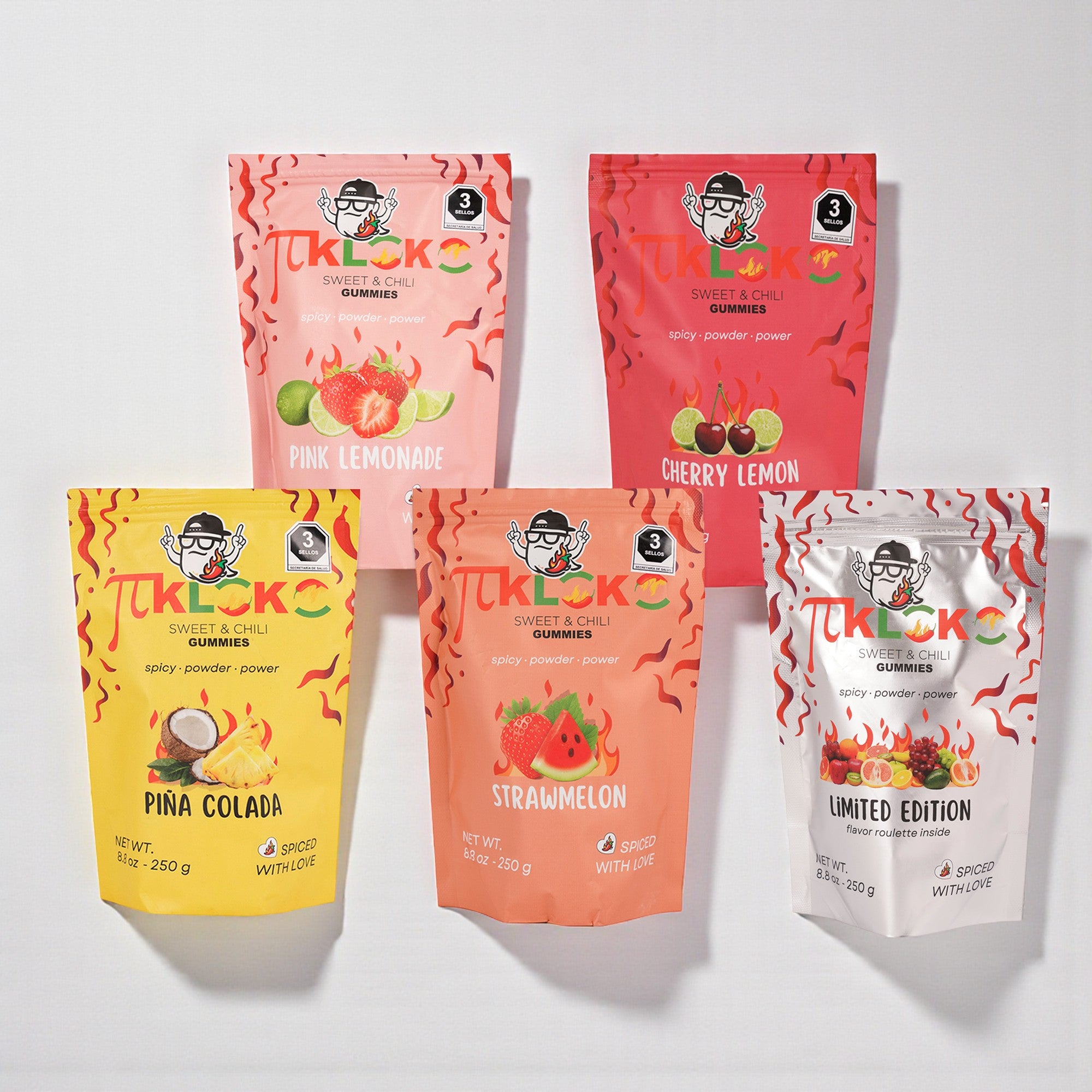 Gomitas limited edition cubiertas con chamoy Pikaloco y chilito Spicy Plus (picoso), luego freeze-dried (liofilizadas) para una textura crujiente, ligera y cero pegajosa. Dulce, frutal, acidito y picante en cada bocado.